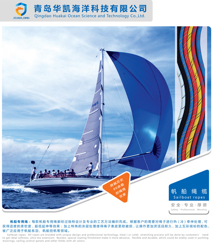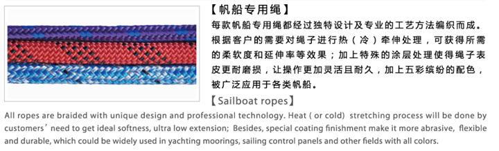 帆船專用繩:每款帆船用繩都經(jīng)過(guò)獨(dú)特設(shè)計(jì)及專業(yè)的工藝方法編織而成,根據(jù)客戶的需要對(duì)繩子進(jìn)行冷(熱)牽伸處理,可獲得所需的柔軟度和延伸率的效果;加上特殊的涂層處理使得繩子表面更耐磨損,讓操作更加靈活且耐久,加上五彩繽紛的配色,被廣泛應(yīng)用于各類(lèi)帆船。